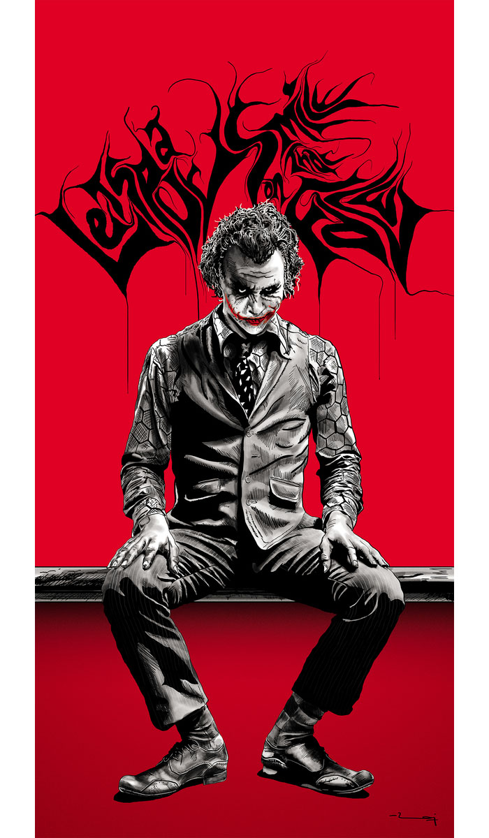 An iconic character, the Joker represents the second in the trilogy of Batman films. The colour red shows his chaos and the sense of danger he brings to the production and the splattered chaotic lettering behind him lists one of his famous lines from the film. It's so powerful in its representation of the film that the original title isn't needed.